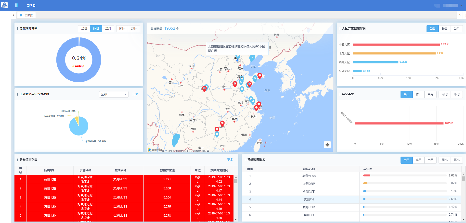 判別異常的數(shù)據(jù)通圖形化方式展示,通過對(duì)異常數(shù)據(jù)的統(tǒng)計(jì)分析,延長(zhǎng)設(shè)備和儀表使用壽命,降低設(shè)備維護(hù)成本,擇優(yōu)選擇更可靠的品牌產(chǎn)品。在地圖上看到所有污水廠分布以及在線情況,多維度對(duì)異常數(shù)據(jù)進(jìn)行統(tǒng)計(jì),全方位剖析數(shù)據(jù)異常統(tǒng)計(jì)情況。