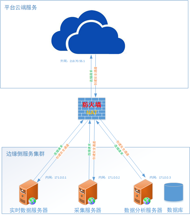 提供NAT或防火墻應(yīng)用場(chǎng)景下邊云互連的解決方案:在互聯(lián)網(wǎng)環(huán)境下,處于NAT或防火墻后端的邊緣側(cè)服務(wù)不能暴露于公網(wǎng)或需與外界做單向的安全隔離,這就要求邊緣側(cè)和云端不能采用常規(guī)的互連機(jī)制,平臺(tái)使用反向連接技術(shù),由邊緣側(cè)向云端主動(dòng)發(fā)起連接請(qǐng)求,然后服務(wù)端在此通道基礎(chǔ)上構(gòu)建安全連接,從而跨越防火墻或NAT連接障礙,同時(shí)又不降低連接的安全性。