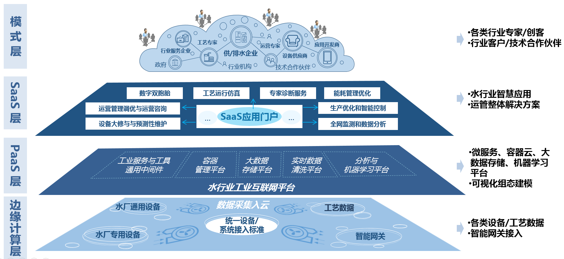 智慧水務(wù)運(yùn)營(yíng)管理平臺(tái)在技術(shù)創(chuàng)新上采用了融合邊緣計(jì)算和云計(jì)算的基礎(chǔ)架構(gòu),包括設(shè)備層、PaaS層和SaaS層和模式層。