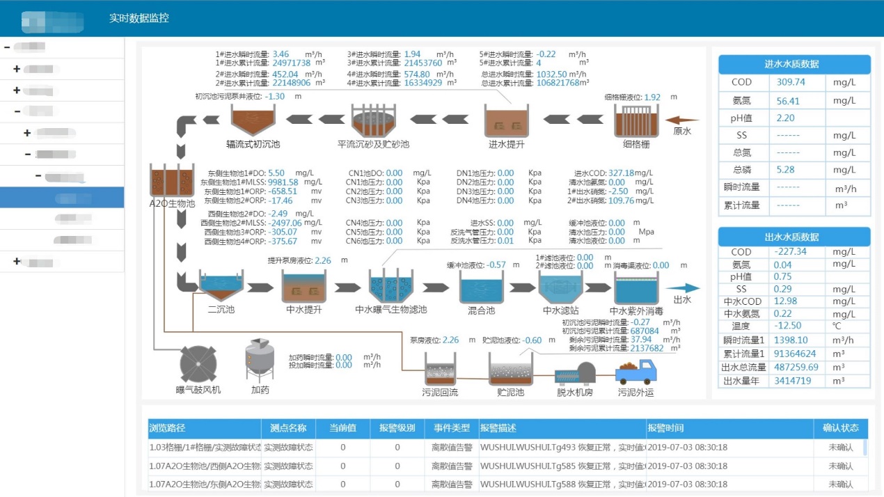 對(duì)污水處理廠不同種工藝段圖形化展示,可以實(shí)時(shí)展示每種工藝段中設(shè)備實(shí)時(shí)狀態(tài)和儀表實(shí)時(shí)數(shù)據(jù)。提高數(shù)據(jù)反饋時(shí)效性,將實(shí)時(shí)數(shù)據(jù)最新的變化情況及時(shí)展示,當(dāng)現(xiàn)場(chǎng)出現(xiàn)設(shè)備或儀表的告警時(shí),可實(shí)時(shí)獲取這些告警信息,在第一時(shí)間展示給現(xiàn)場(chǎng)操作人員。