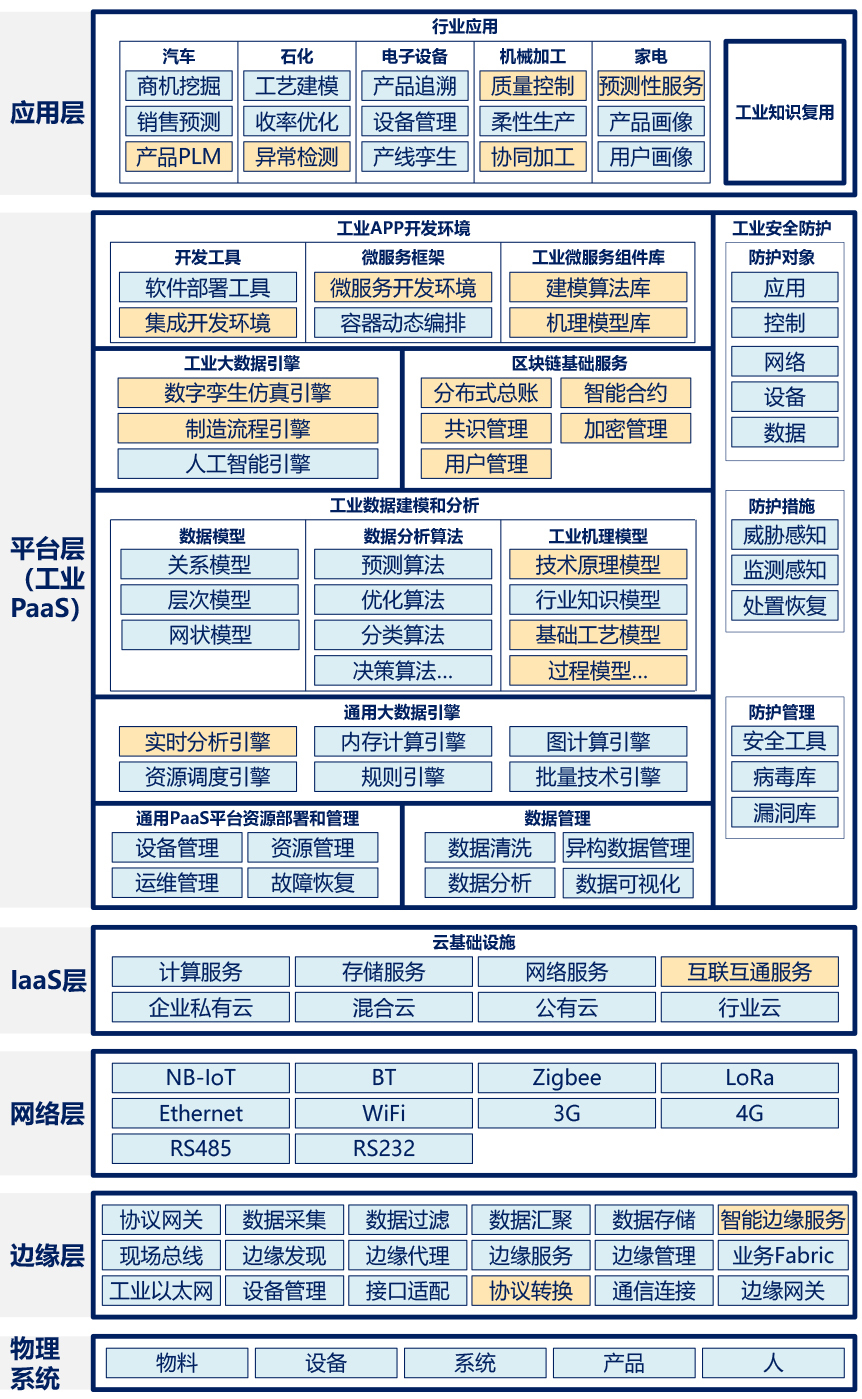 應用層(工業SaaS層):提供從需求分析、產品研發、生產制造、過程控制、供應鏈協同到營銷服務的各類工業APP及APP框架,涵蓋需求畫像、產品畫像、行為畫像、輔助設計、輔助分析、數據計算、協同仿真、工廠設計、資源計劃、流程仿真、物流管理、線上實訓、過程監測、運行日志、設備運維、過程優化、過程控制、供應鏈管理、企管財務、銷售管理、資產管理、運營決策、輿情分析、智能客服、質量溯源、維修備件、遠程服務等全價值鏈應用。以及面向用戶的精準營銷、智慧研發、協同制造、智慧服務、智能供應鏈等應用,面向供應商和開發者的用戶運營、開發者社區、產業聯盟協作門戶等的業務綜合應用。