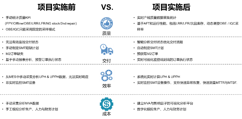 面向智能化生產的SMT產線優化方案在聯想多個制造工廠、多條產線的實施,提升UPPH(單位人時產能)1.7%,產品FPY(一次通過率)0.54%,OTS(工程樣件)交付率5%,每年提升產線利潤200萬美金以上。