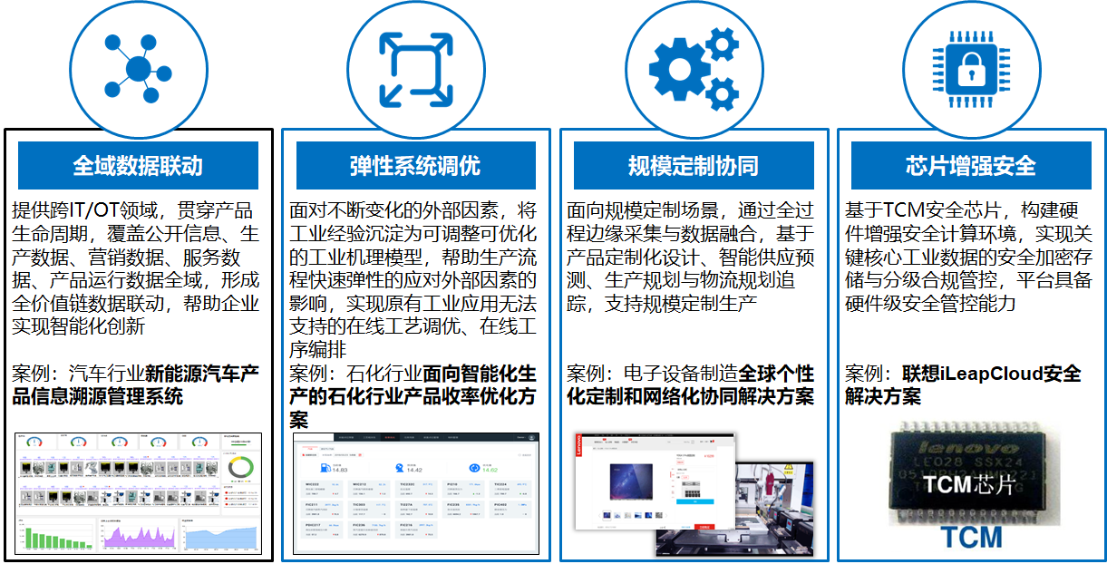 作為全球最大的電子設備制造商之一,聯想以自身“互聯網+先進制造”轉型為切入點,積極開展聯想自身的智能制造,打造了契合自身戰略需要,具有自主知識產權,安全可靠的工業互聯網平臺—iLeapCloud(以下簡稱“iLeapCloud 平臺”或“聯想工業互聯網平臺”)。經過了超過7年的積累和發展,iLeapCloud平臺在內外部廣泛實踐的基礎上,發展出如下平臺亮點:全域數據聯動、彈性系統調優、規模定制協同,并依托芯片增強安全(TCM芯片)的工業核心數據和工藝參數的完備安全管理能力,廣泛應用于汽車制造、石油化工、電子設備、機械加工、家電等行業,為客戶帶來諸多價值。