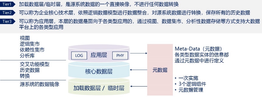 總體數據架構分為加載數據層/臨時層、核心數據層、業務應用層,如下圖所示,
