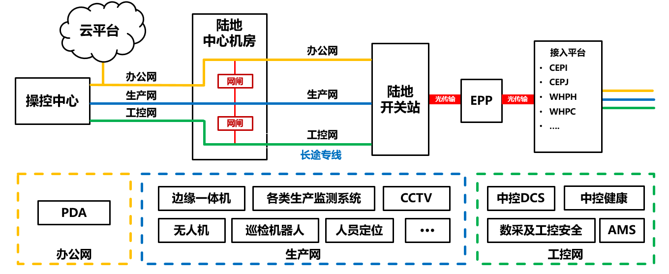 (1)利用海底光纜搭建海上油田群光纖環(huán)路,并通過(guò)陸地省際專線接入企業(yè)信息中心,為海量數(shù)據(jù)入湖和云邊高效協(xié)同構(gòu)建高安全、高可靠、低時(shí)延的信息高速公路。