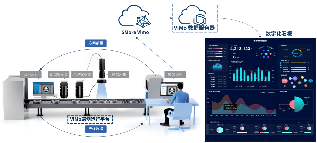 產線設備在生產過程種通過Vimo應用程序,配合現場的相機、光源、PLC等對實時生產的產品進行質量檢測,檢測的相關數據(圖片、檢測結果、缺陷類型等)上傳到SMore Vimo,進行AI模型訓練,處理后的數據通過ViMo數據服務器進行數字化看板展示基于不同的缺陷,思謀的AI技術進行數據獨立存儲管理,一方面可以更有效的真的某種缺陷進行數字增量強化,又可以更好的為管理層提供高效的管理決策依據,優化生產。