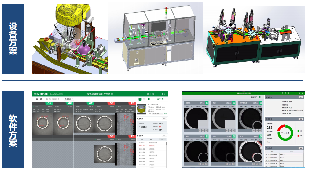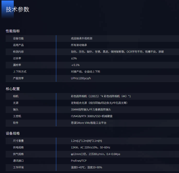 攻克了兩大行業難題——對生銹缺陷的精準識別,以及對臟污、壓傷缺陷的精準區分,實現了視覺技術在軸承檢測應用的新突破。方案兼容超過20種產品型號,可一次識別23種缺陷,檢出≥99.59%,過檢率≤5%,檢測水平領先行業。2實現百分百人力替代