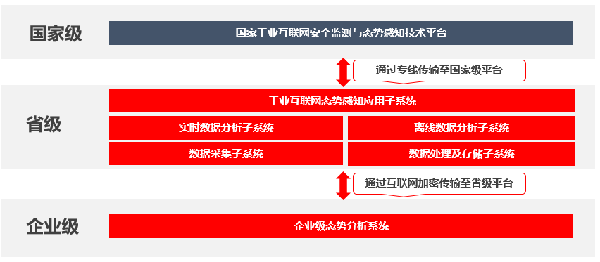 通過建設分布式工業互聯網數據采集系統數據處理及存儲系統等子系統,構建省級工業互聯網安全監測與態勢感知平臺和企業級態勢分析系統從監管層面實現省級工業互聯網安全全面及實時的監測