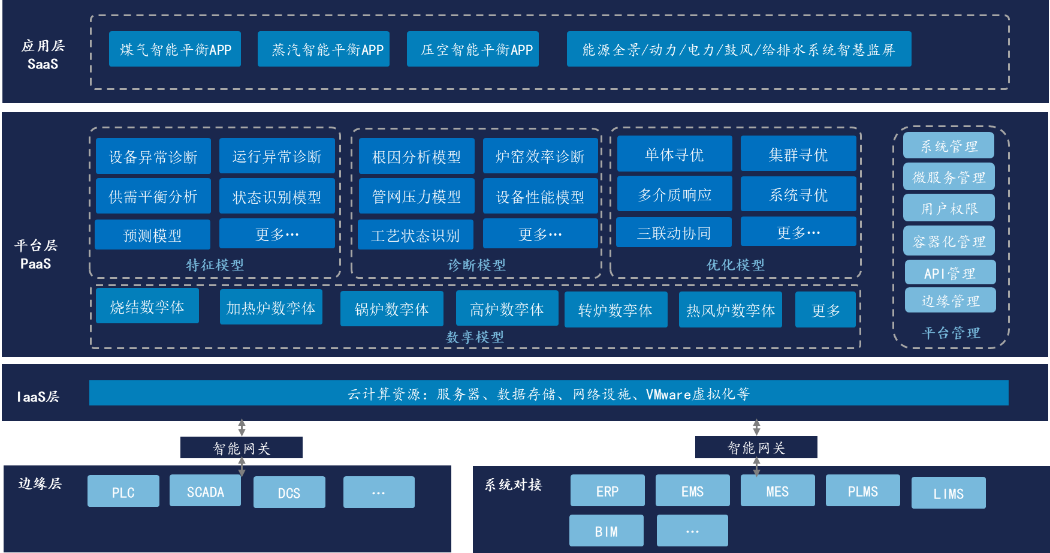 在Thingswise iDOS 平臺基礎上搭建鋼鐵行業的能源管控平臺,規范化管理多元多流能源數據、構建能源大數據中心、開發能源系統的數字孿生,通過數據建模滿足業務功能,具體軟件架構如下: