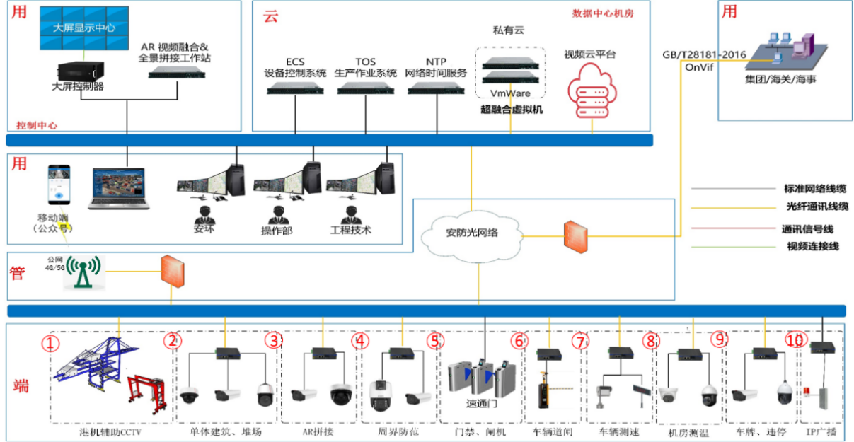 :該層次對應著碼頭的八種應用場景,包括堆場(U型通道)、輔建區、單體建筑、港機、周界、道路、閘口、停車場等。在每個場景中部署相應的安防設備和系統,以實現對該場景的監控和安全防范。