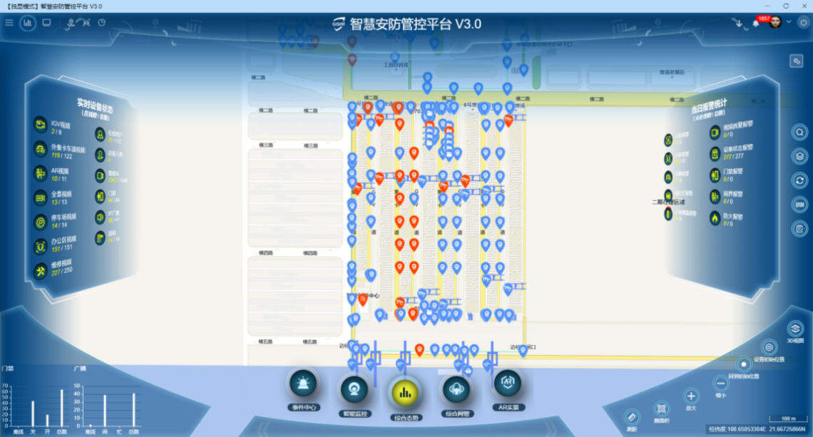 三種模式(三維地圖(綜合態勢)、二維地圖、智能監控)