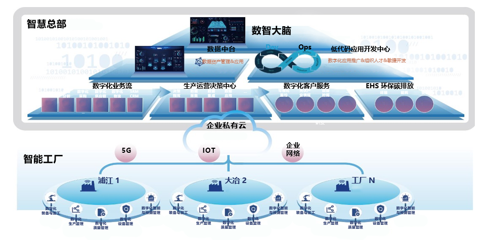 整個(gè)方案采用“智慧總部+智能工廠”架構(gòu),包括集團(tuán)總部側(cè)和生產(chǎn)基地側(cè),其中:
