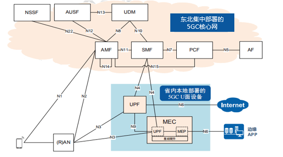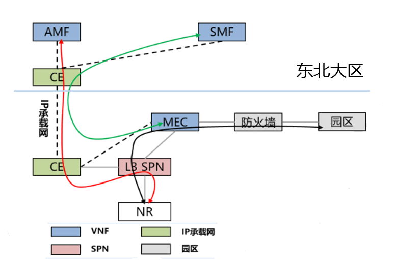 MEC設(shè)備部署在企業(yè)信息化機(jī)房。gNB與AMF間的 N2 接口通過(guò)SPN+IP承載網(wǎng)承載。gNB 與邊緣UPF的N3接口通過(guò) SPN 承載。要求與邊緣 UPF對(duì)接的SPN提供3層能力。SMF與邊緣UPF間的N4接口采用直連方式,通過(guò)SPN+IP承載網(wǎng)互通。邊緣UPF通過(guò)IP承載網(wǎng)網(wǎng)管CE與東北大區(qū)EMS進(jìn)行通信。網(wǎng)管接口通過(guò)SPN+IP承載網(wǎng)承載。