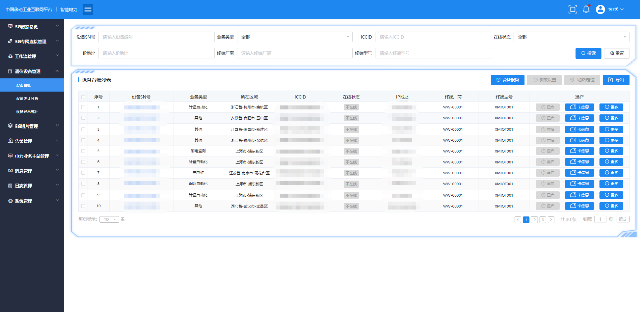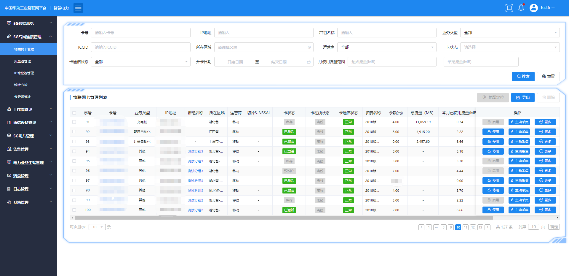 5G電力專網(wǎng)連接管理,可實(shí)現(xiàn)對(duì)于電力業(yè)務(wù)中使用的無(wú)線通信卡資源的管理,對(duì)其進(jìn)行記錄和統(tǒng)計(jì)分析。無(wú)線通信卡數(shù)據(jù)包括IP地址管理、域名管理、卡資費(fèi)情況、流量使用情況等。目前平臺(tái)已接入1萬(wàn)多張物聯(lián)卡,建立卡臺(tái)賬、資費(fèi)等信息,實(shí)現(xiàn)物聯(lián)網(wǎng)卡的精細(xì)化管理。