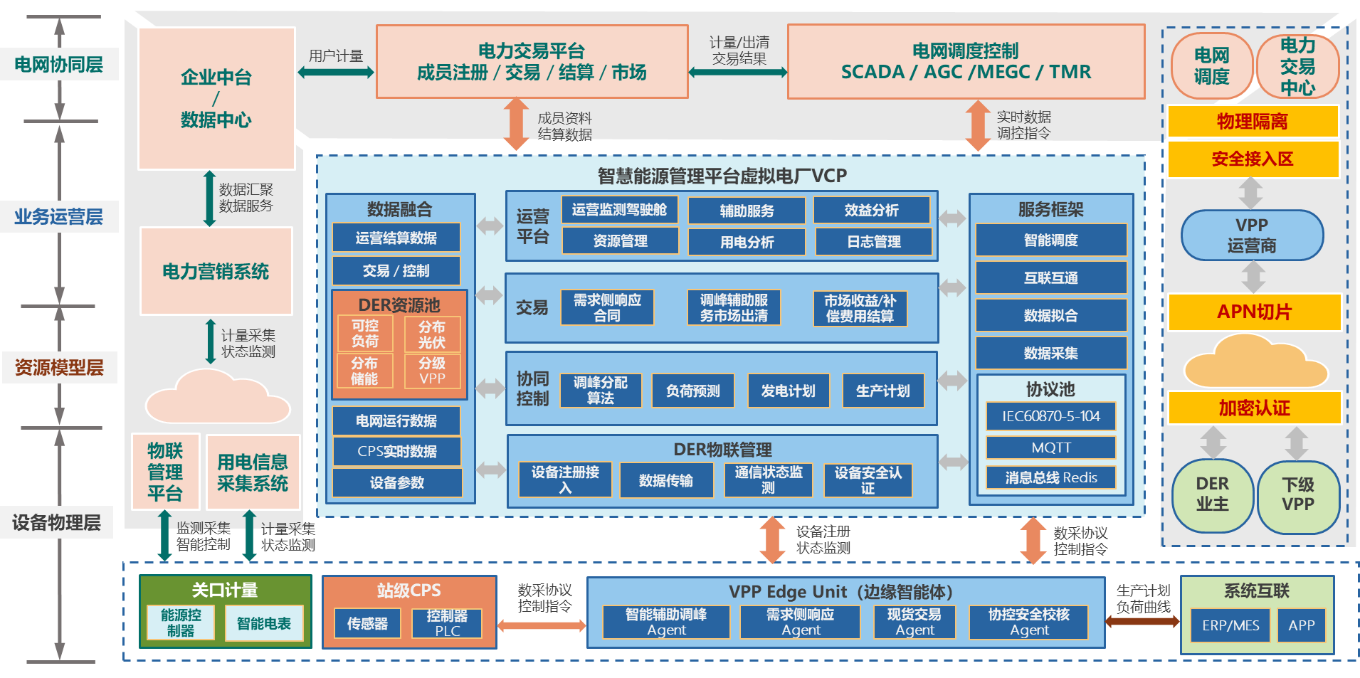 虛擬電廠運(yùn)營(yíng)平臺(tái)聚合分布式能源和需求側(cè)資源參與電網(wǎng)運(yùn)行,將分布式發(fā)電DG、分布式儲(chǔ)能設(shè)施和可控負(fù)荷有機(jī)結(jié)合,通過(guò)配套的調(diào)控技術(shù)、通信技術(shù)實(shí)現(xiàn)對(duì)分布式能源進(jìn)行聚合、優(yōu)化、協(xié)同控制的載體,以作為一個(gè)特殊電廠參與電力市場(chǎng)和電網(wǎng)運(yùn)行,可以看作是一種先進(jìn)的區(qū)域性電能集中管理模式,實(shí)現(xiàn)電源側(cè)的多能互補(bǔ)和負(fù)荷側(cè)的靈活互動(dòng),其核心在于“聚合”和“通信”。
