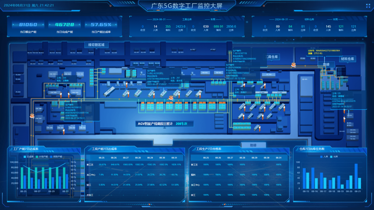 智造大腦平臺包含三個子系統工業制造模型、設備聯網模型、工業大數據模型,以5G網絡為底座打造全連接工廠,將研發、生產、倉儲、銷售等業務環節實現要素數字化,通過5G全流程數字化運營智造平臺統一接入各業務系統,數據匯集,可視化展示。