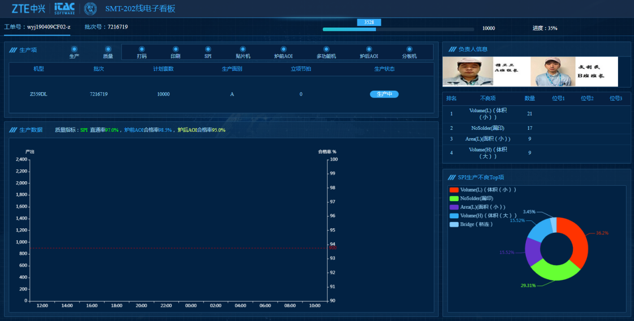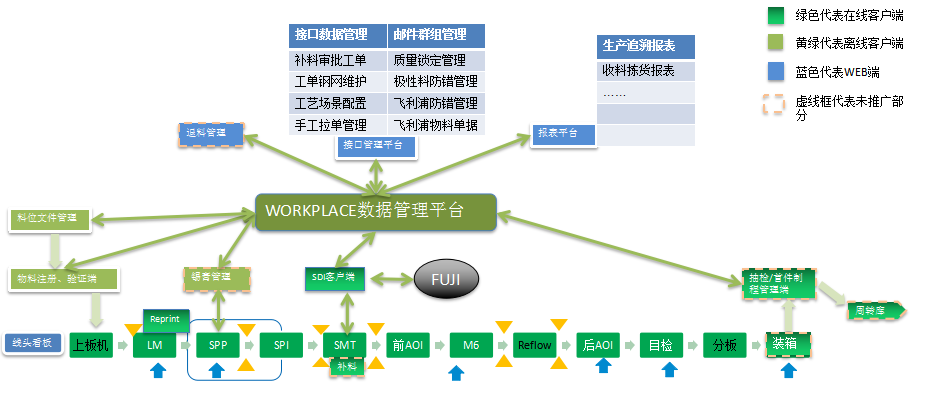 關鍵工位的采集數(shù)據(jù)都與板號關聯(lián),基于設備實時聯(lián)機實現(xiàn)產(chǎn)品在制工序全程閉環(huán)制程控制、高精度的單板物料追溯、SPI/AOI檢測信息追溯、實現(xiàn)(印刷機、前后AOI、SPI和整SMT段)良率、直通率的統(tǒng)計管理,工位的作業(yè)數(shù)據(jù)、生產(chǎn)報警、故障報警等等。
