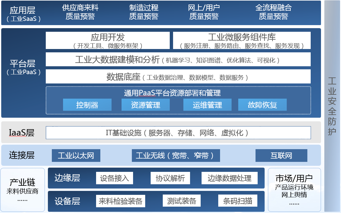 供應(yīng)商數(shù)據(jù)采集系統(tǒng)云化部署,制訂統(tǒng)一的數(shù)據(jù)回傳格式,打通與來料供應(yīng)商的系統(tǒng)對接;制造過程數(shù)據(jù)通過互聯(lián)網(wǎng)、物聯(lián)網(wǎng)等方式進行實時采集;定時將產(chǎn)品網(wǎng)上運行環(huán)境數(shù)據(jù)及輿情數(shù)據(jù)采集、回傳到數(shù)據(jù)底座中。