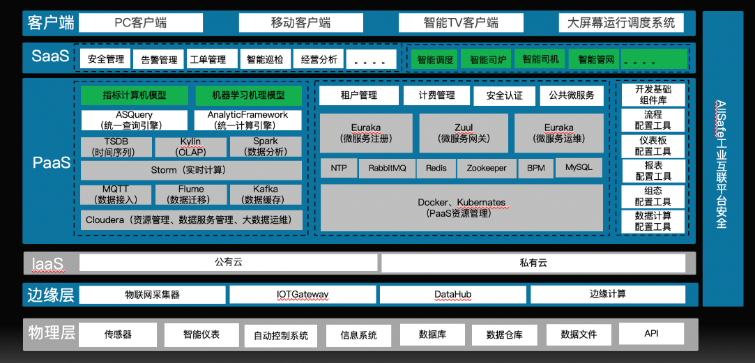 PaaS層:云端平臺(tái)層,提供了面向工業(yè)的工業(yè)大數(shù)據(jù)、工業(yè)微服務(wù)和交付工具等。該層是工業(yè)互聯(lián)網(wǎng)的核心層,其中工業(yè)大數(shù)據(jù)提供了面向工業(yè)的時(shí)間序列數(shù)據(jù)引擎、實(shí)時(shí)計(jì)算數(shù)據(jù)引擎、數(shù)據(jù)緩存引擎、數(shù)據(jù)檢索引擎等。工業(yè)微服務(wù)提供了基于容器化管理的各種基礎(chǔ)服務(wù)和各種微服務(wù)管理引擎等。面向熱能生產(chǎn),該層提供了面向熱能生產(chǎn)的數(shù)據(jù)治理、數(shù)據(jù)預(yù)處理組件、數(shù)據(jù)分析組件,以及面向熱能生產(chǎn)的公共微服務(wù)。在開發(fā)工具部分,提供了面向熱能生產(chǎn)的組態(tài)工具、報(bào)表工具等。