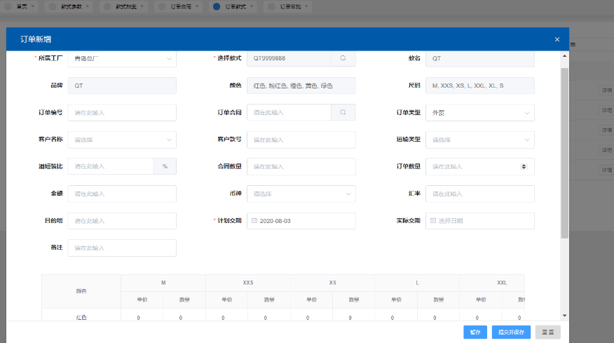根據合同及關聯款式增加生產訂單,可分色分碼設定數量,并經自主設置的審批流審批通過后下發至生產部門進行生產。