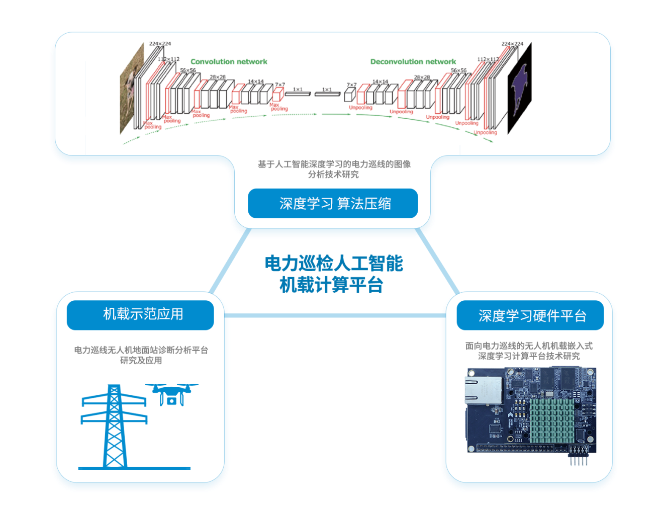 通過研究適用電力無人機巡檢的目標檢測深度學習算法,開發適用于低功耗、低載荷限制的無人機機載人工智能計算平臺,研究機載人工智能計算平臺與無人機系統的集成技術,提出機載人工智能計算平臺與無人機的交互方案,以實現電力無人機巡檢的目標智能檢測識別、云臺自動調整對目標部件逐個拍攝,提升巡檢效率。