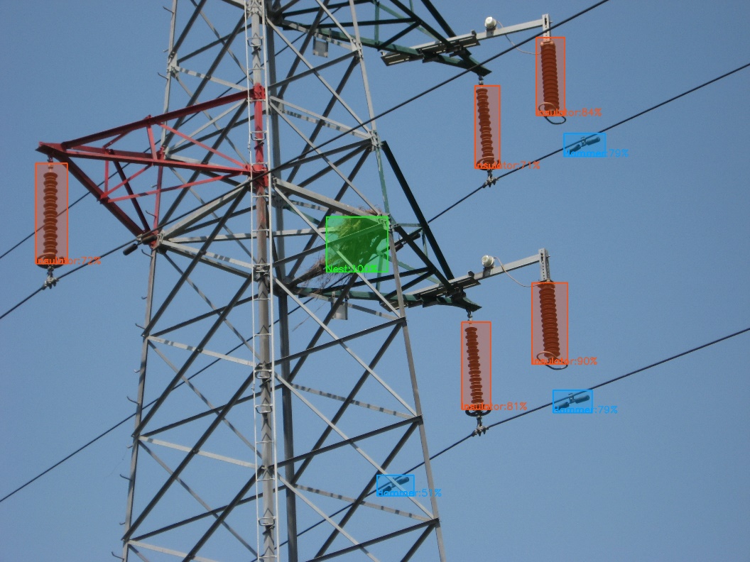 ③輸電線路部件檢測識別:檢測在輸電線路中的絕緣子、三角板、防震錘等;