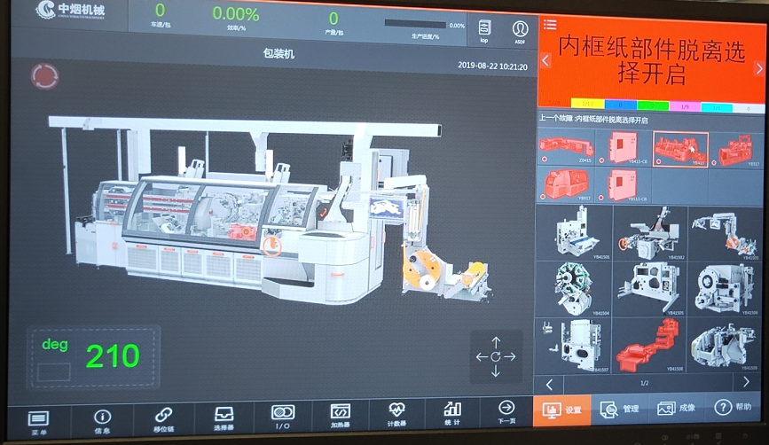 ZB415煙機產線由主機加輔機組成,體積龐大。該智能機組內置超過400個采集點位,每個點位的數據采集頻率均為毫秒級。因此系統每秒會產生海量的數據,要將這些數據實時的傳輸到數字孿生系統中就需要5G網絡大帶寬的加持,通過數字孿生系統對機組的運行狀態進行遠程的控制,如開機、停機、復位、包裝速度調整等。5G網絡的低時延、高可靠性確保了這些控制指令下發的實時性和可靠性。當機組某一個零部件出現故障時,數字孿生系統會通過布置在機組內部的傳感器檢測到該零件,并立即在系統內進行報警;同時會聯動監控攝像頭定位到出現故障的零部件的位置,并放大監控畫面以便于控制中心的專家進行進一步的故障診斷和確認。