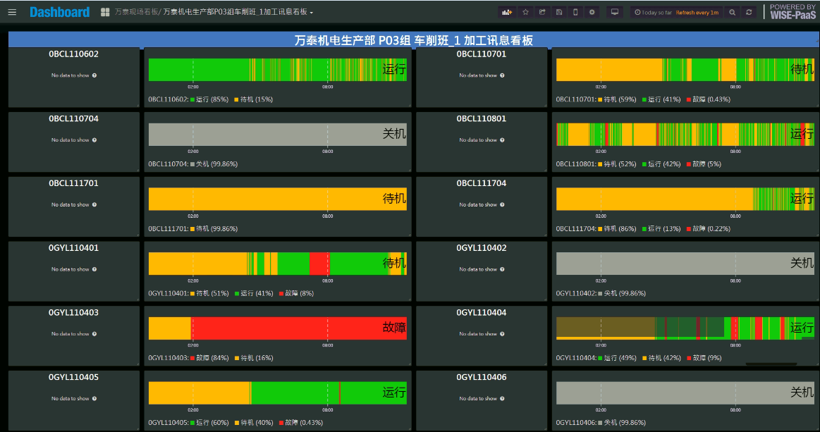 從底層數據采集到數據邊緣運算,并通過WisePaas Dashboard呈現,實現數據的可視化。初步擬定以車床車間和銑床車間為一期工程,提供開放式系統平臺,全面實現設備聯網、數據采集,數位化智能管理等預期。在一期工程完成后,借助研華方案強大的可擴展性,在系統架構上可彈性實現其他廠區車間的工程布建。