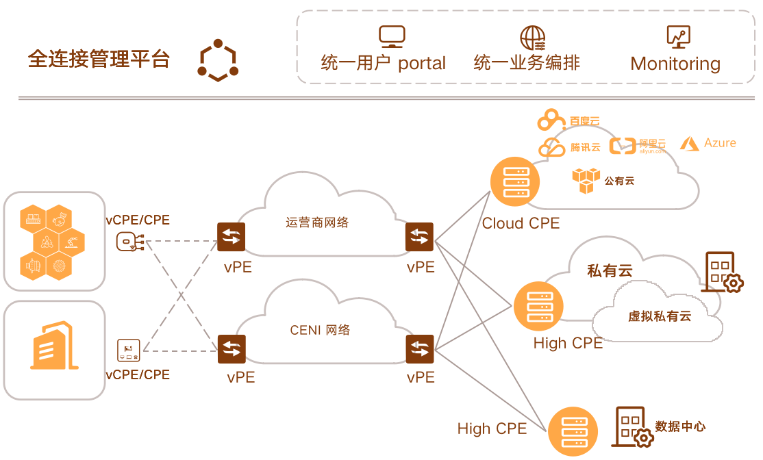 包括CPE、VPE、端局云、邊緣計(jì)算節(jié)點(diǎn)、光傳輸鏈路和數(shù)據(jù)中心。實(shí)現(xiàn)網(wǎng)絡(luò)、計(jì)算和存儲(chǔ)資源的監(jiān)測(cè)、配置。