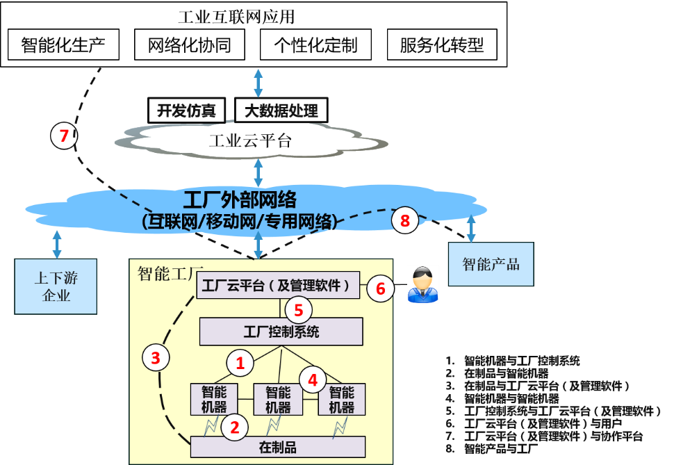 本方案在工業互聯網網絡體系架構中,覆蓋智能機器與工廠控制系統,工廠控制系統與工廠云平臺(及管理軟件)。詳見工業互聯網體系架構圖中的1,5兩部分。