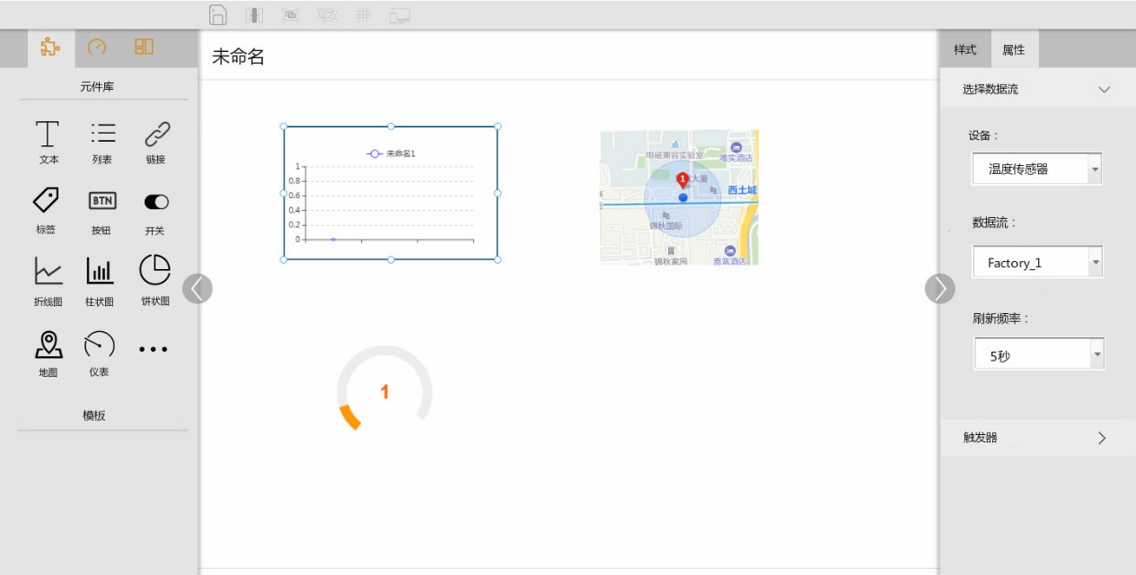 應用管理子系統:用戶可自行創建應用,對應用及其生命周期進行操作和管理。例如可創建一個環境監測應用,管理其中的監測設備、監測數據,對應的監測視圖、設置的報警觸發器、告警規則及告警處理等。用戶可通過可視化應用編輯界面來快速創建應用,如下圖。通過拖拽左側應用元件庫的元件,在右側選擇相應的設備、數據流等進行綁定,即可完成應用的創建,簡單快捷。