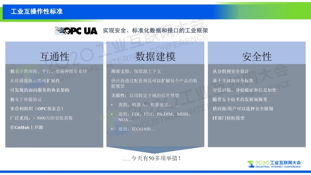 “OPC UA是一個擁有良好互操作性的標準,它為用戶提供了安全和標準化的信息和接口,很多會員也好,供應商也好,終端用戶也好,使用OPC UA是因為它能夠很好的實現跨供應商的數據交互。同樣,OPC UA的開放性也可以使這些終端用戶為未來即將到來的技術實現做好準備。OPC UA通過三種方式來保障信息安全,即信息加密、身份識別、權限管理,與操作系統大致相似,所以OPC UA也被稱為是能夠提供系統級安全防護的標準。總的來說,OPC UA讓機器擁有信息模型,通過信息模型擁有自我描述的能力,從而能夠極大的減少配置工作,降低工程成本。”