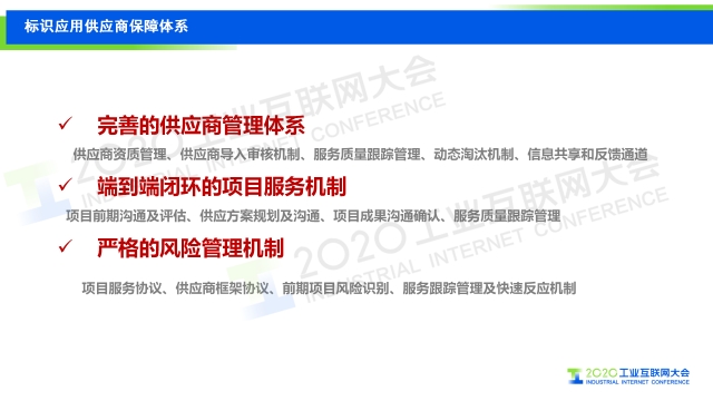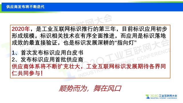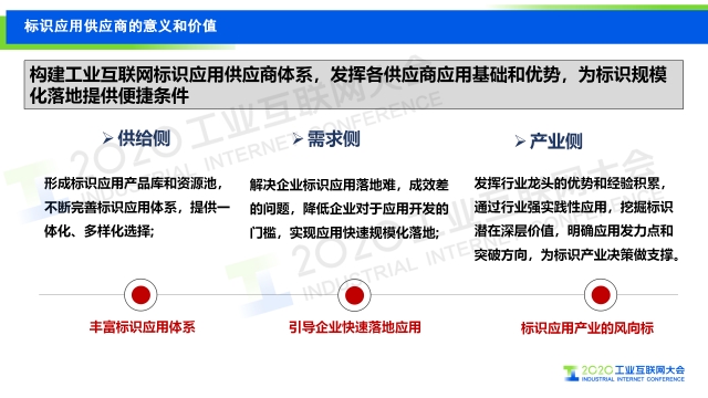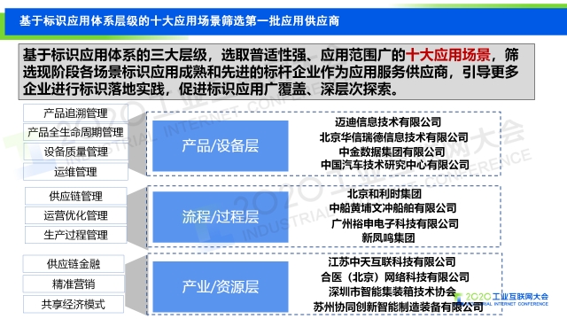 在2020工業(yè)互聯(lián)網(wǎng)大會“工業(yè)互聯(lián)網(wǎng)標(biāo)識”主題論壇上,中國信息通信研究院工業(yè)互聯(lián)網(wǎng)和物聯(lián)網(wǎng)研究所副總工程師羅松分享了我國工業(yè)互聯(lián)網(wǎng)標(biāo)識解析體系建設(shè)情況及中國信息通信研究院在建立標(biāo)識應(yīng)用供應(yīng)商體系方面所做的工作,會上還發(fā)布了基于標(biāo)識應(yīng)用體系三大層級十個(gè)應(yīng)用場景的首批工業(yè)互聯(lián)網(wǎng)標(biāo)識應(yīng)用供應(yīng)商合作伙伴名單。