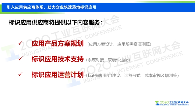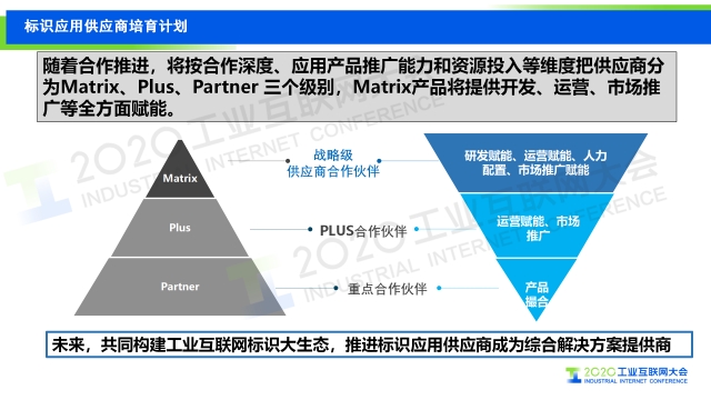 我國工業(yè)互聯(lián)網(wǎng)標(biāo)識解析體系正逐步完善,標(biāo)識應(yīng)用初具規(guī)模。當(dāng)前,中國信息通信研究院按照標(biāo)識應(yīng)用對象的不同層級構(gòu)建工業(yè)互聯(lián)網(wǎng)標(biāo)識應(yīng)用體系,分析應(yīng)用價(jià)值,能夠引導(dǎo)標(biāo)識應(yīng)用向更廣范圍、更大規(guī)模、更深層次發(fā)展。 中國信息通信研究院正在建立標(biāo)識應(yīng)用供應(yīng)商體系,發(fā)揮各供應(yīng)商應(yīng)用基礎(chǔ)和優(yōu)勢,為標(biāo)識規(guī)?;涞靥峁┍憬輻l件,將從三個(gè)方面助力企業(yè)快速落地標(biāo)識應(yīng)用。一是豐富標(biāo)識應(yīng)用體系,形成標(biāo)識應(yīng)用產(chǎn)品庫和資源池,不斷完善標(biāo)識應(yīng)用體系,提供一體化、多樣化選擇; 二是引導(dǎo)企業(yè)快速落地應(yīng)用,解決企業(yè)標(biāo)識應(yīng)用落地難,成效差的問題,降低企業(yè)對于應(yīng)用開發(fā)的門檻,實(shí)現(xiàn)應(yīng)用快速規(guī)?;涞? 三是形成標(biāo)識應(yīng)用產(chǎn)業(yè)風(fēng)向標(biāo),發(fā)揮行業(yè)龍頭的優(yōu)勢和經(jīng)驗(yàn)積累,通過行業(yè)強(qiáng)實(shí)踐性應(yīng)用,挖掘標(biāo)識潛在深層價(jià)值,明確應(yīng)用發(fā)力點(diǎn)和突破方向,為標(biāo)識產(chǎn)業(yè)決策做支撐。 詳情見以下演講PPT 敬請閱讀 本次發(fā)布的工業(yè)互聯(lián)網(wǎng)標(biāo)識應(yīng)用供應(yīng)商將提供應(yīng)用產(chǎn)品方案規(guī)劃、應(yīng)用方案設(shè)計(jì)、應(yīng)用所需資源測算,標(biāo)識應(yīng)用技術(shù)支持、系統(tǒng)對接、軟硬件適配,標(biāo)識應(yīng)用運(yùn)營計(jì)劃,標(biāo)識解析應(yīng)用建議、運(yùn)營形式、成本審視及規(guī)劃等服務(wù)。 未來,中國信通院工業(yè)互聯(lián)網(wǎng)所將與合作伙伴共同構(gòu)建工業(yè)互聯(lián)網(wǎng)標(biāo)識生態(tài),支持標(biāo)識應(yīng)用供應(yīng)商成為綜合解決方案提供商,不斷壯大、完善標(biāo)識供應(yīng)商體系。