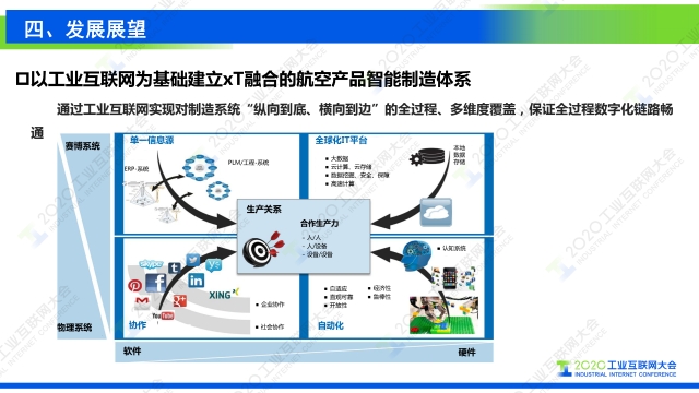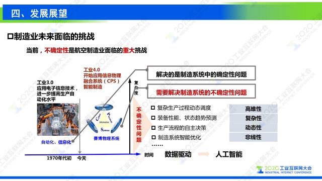 “不確定性是航空制造面臨的一個重大挑戰。工業3.0主要是實現自動化,解決的是制造系統中的確定性問題。工業4.0開始建設CAPP物理系統,也就是我們說的CPS系統,需要解決制造系統中的這么一個不確定性,例如復雜生產過程、動態調度,裝配性能狀態的趨勢預測,包括生產流程、工業流程的自主決策。整個智能制造系統智能化是非常重大的一個挑戰。為了解決未來航空制造中存在的不確定性問題,需要高校的把人工智能、工業大數據至少進行融合,高校低成本的獲取數據,并利用數據,通過數據利用不斷優化制造過程,驅動管理優化與變革。