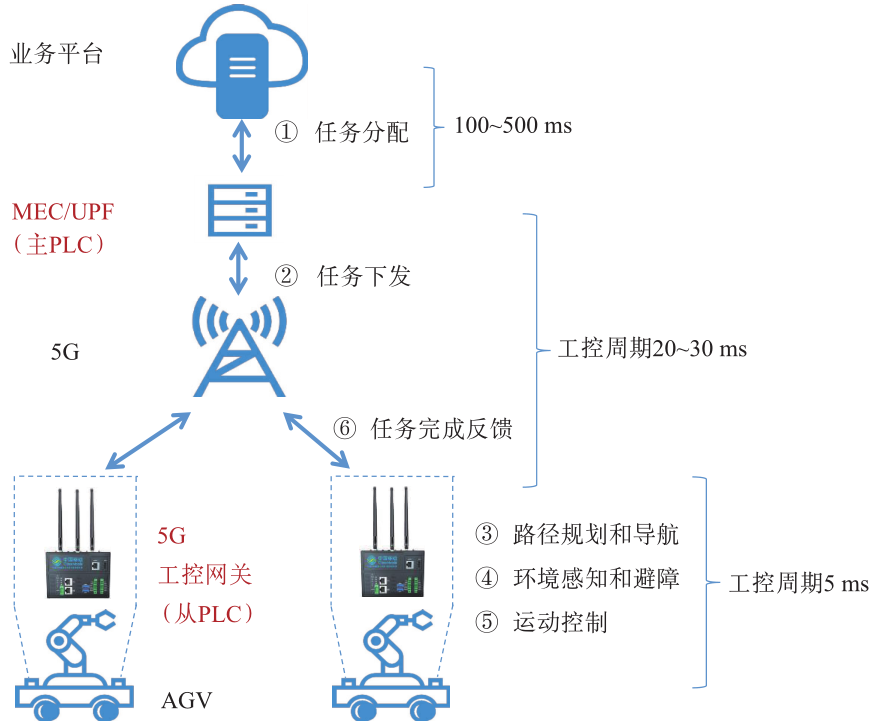 針對該場景需求,5G工控系統搭建了“主vPLC-從vPLC”端邊協同架構(見圖4)。在邊緣側,主vPLC部署在UPF上,實現PLC的集中化部署。主vPLC負責接收制造執行系統(Manufacturing Execution System,MES)下發的任務指令,將任務封裝成控制指令,發送給AGV攜帶的從vPLC,同時接收從vPLC執行過程中的反饋信息。在現場側,從vPLC部署在5G工控網關上,實現對PLC和5G 數據傳輸設備(Data Terminal Unit,DTU)的“二合一”替換。一方面,從vPLC負責接收到主vPLC發送的控制指令,通過傳感器控制AGV的驅動系統,實現精確的移動和定位。另一方面,當AGV到達目的地,從vPLC將任務執行結果反饋給主vPLC,上報任務完成情況。