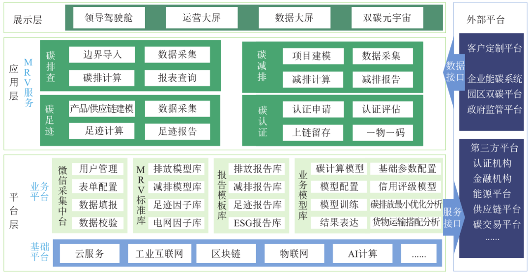 平臺(tái)層包含基礎(chǔ)平臺(tái)層與業(yè)務(wù)平臺(tái)層。基礎(chǔ)平臺(tái)層提供了云服務(wù)、物聯(lián)網(wǎng)、區(qū)塊鏈、大數(shù)據(jù)、人工智能(Artificial Intelligence,AI)計(jì)算等底層基礎(chǔ)功能;業(yè)務(wù)平臺(tái)層集成了數(shù)據(jù)采集中臺(tái)、核算標(biāo)準(zhǔn)庫(kù)、報(bào)告模板庫(kù)、業(yè)務(wù)模型庫(kù)等業(yè)務(wù)數(shù)據(jù)。應(yīng)用層提供碳盤(pán)查、碳足跡、碳減排以及碳認(rèn)證4個(gè)大功能模塊,為企業(yè)提供標(biāo)準(zhǔn)監(jiān)測(cè)、報(bào)告及核查流程。展示層借助元宇宙、數(shù)字孿生等能力搭建領(lǐng)導(dǎo)駕駛艙、元宇宙空間,便于數(shù)據(jù)實(shí)時(shí)呈現(xiàn)。