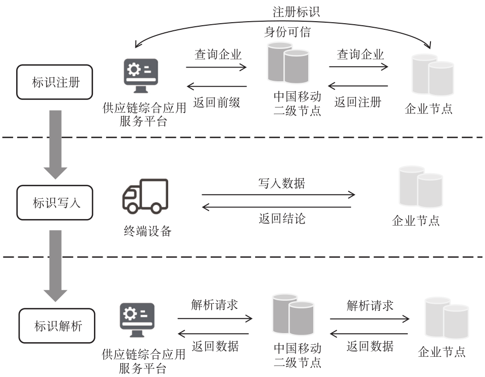 為實(shí)現(xiàn)對(duì)電力、燃?xì)狻⑿旭偫锍痰然顒?dòng)數(shù)據(jù)的可信采集,保證數(shù)字身份、個(gè)人資產(chǎn)和設(shè)備信息的隱私安全,本文以雙碳綠色供應(yīng)鏈為應(yīng)用場(chǎng)景,基于工業(yè)互聯(lián)網(wǎng)標(biāo)識(shí)解析體系,將工業(yè)互聯(lián)網(wǎng)主動(dòng)標(biāo)識(shí)創(chuàng)新技術(shù)引入到雙碳綠色供應(yīng)鏈數(shù)據(jù)采集服務(wù)中。通過(guò)主動(dòng)標(biāo)識(shí)解析技術(shù),打通供應(yīng)鏈環(huán)節(jié)中多主體系統(tǒng)間的信息傳輸壁壘(見(jiàn)圖1),主要業(yè)務(wù)流程包括以下3方面。