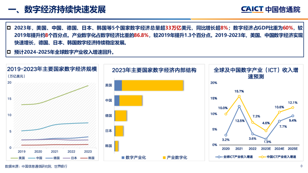 主要國家數字經濟持續快速發展。總體看,2023年,美國、中國、德國、日本、韓國等5個國家數字經濟總量超33萬億美元,同比增長超8%;數字經濟占GDP比重為60%,較2019年提升約8個百分點。2019-2023年,德國、日本、韓國數字經濟穩定發展,美國、中國數字經濟實現快速增長。內部結構看,產業數字化對數字經濟增長的引擎作用持續發揮,2023年占數字經濟比重達86.8%,較2019年提升1.3個百分點;預計2024-2025年,全球數字產業收入增速回升,穩步夯實數字經濟發展基礎。