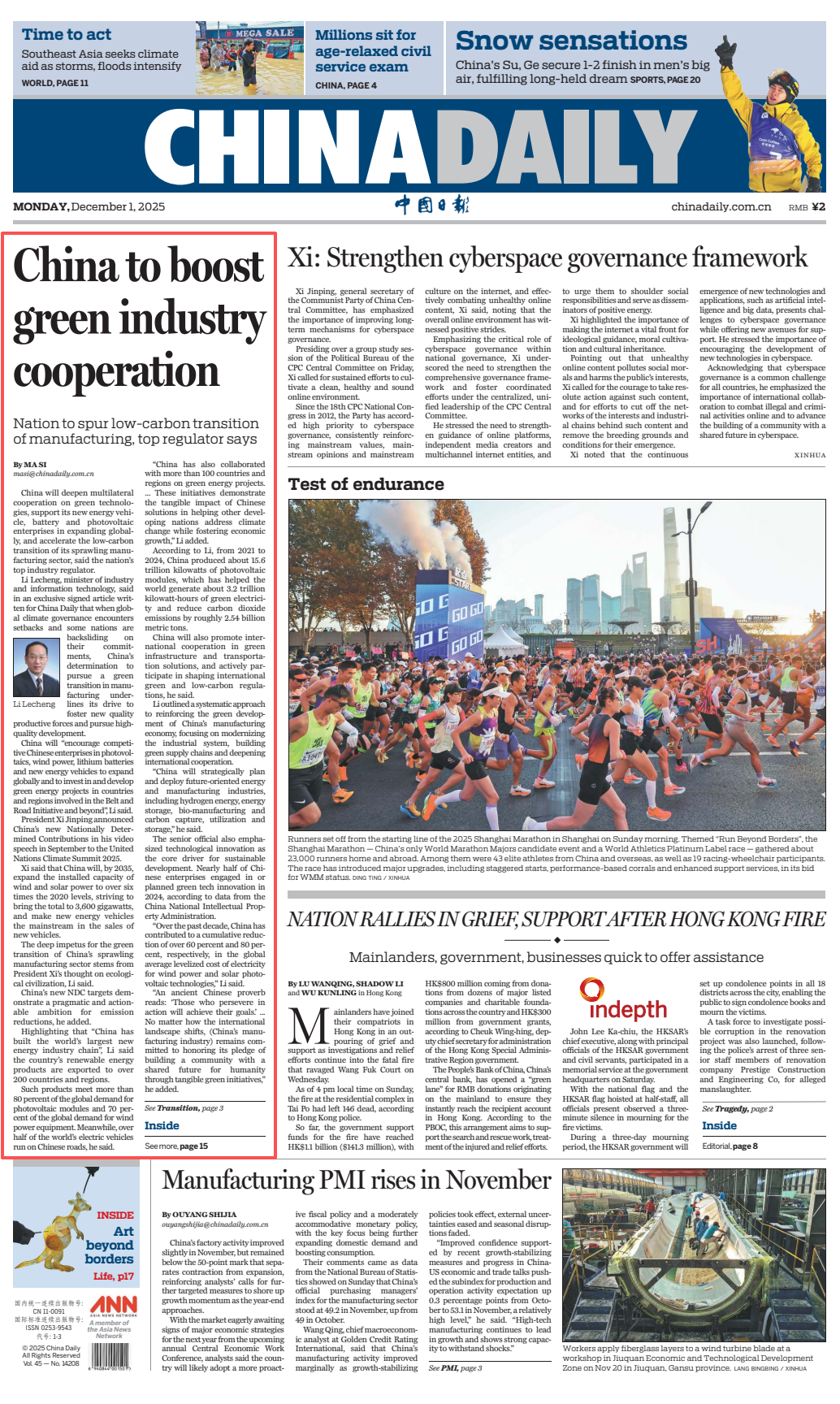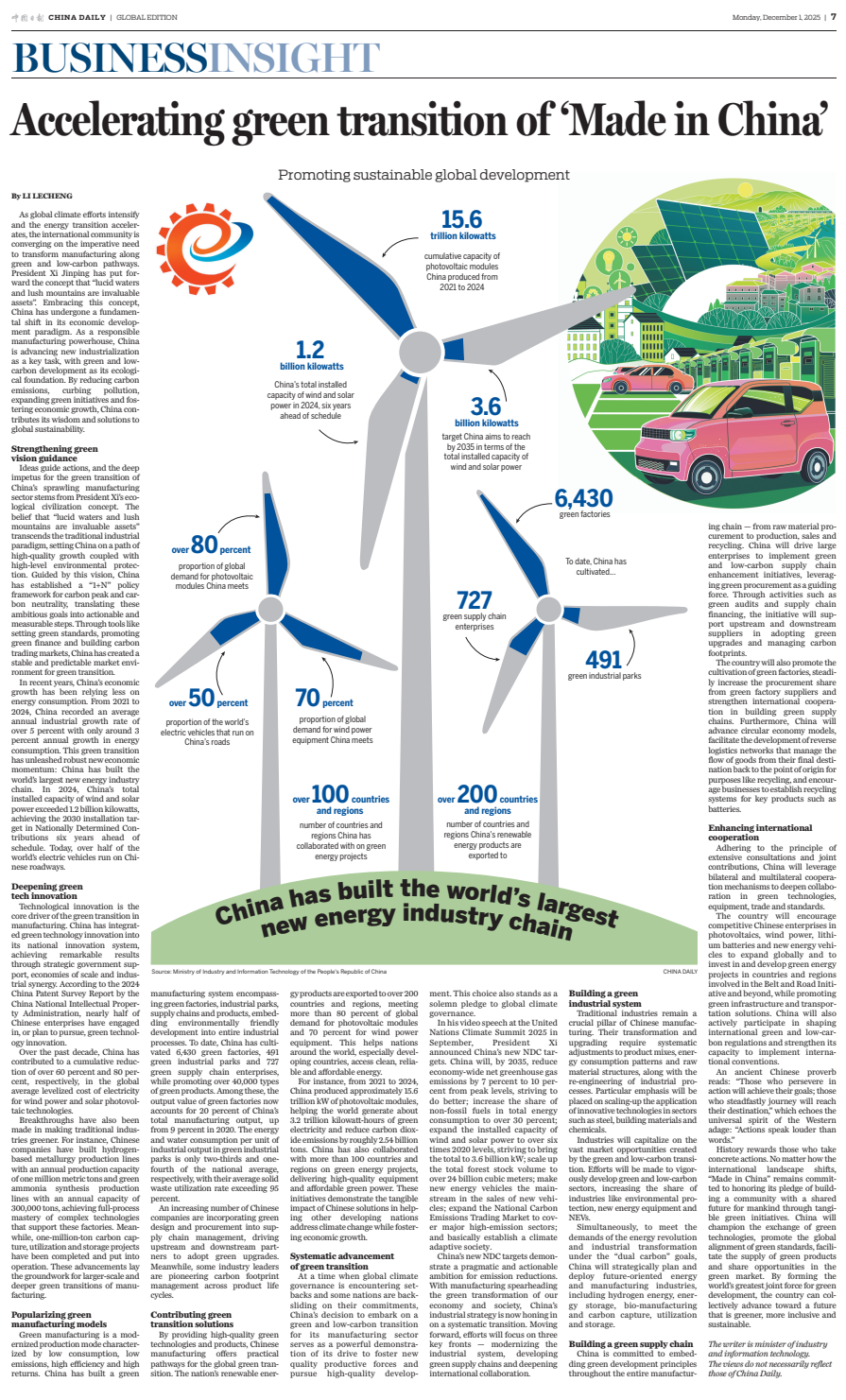 12月1日,《中國日報》刊發工業和信息化部黨組書記、部長李樂成英文署名文章,題為《加快中國制造綠色低碳轉型 促進全球可持續發展》。全文如下: