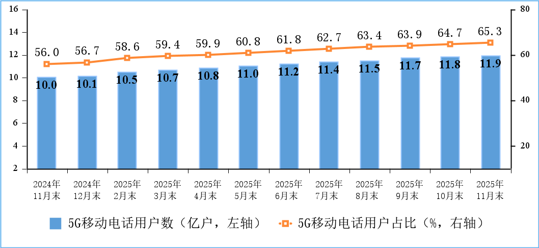 5G用戶規(guī)模持續(xù)擴(kuò)大。截至11月末,三家基礎(chǔ)電信企業(yè)及中國廣電的移動(dòng)電話用戶總數(shù)達(dá)18.28億戶,比上年末凈增3854萬戶。其中,5G移動(dòng)電話用戶達(dá)11.93億戶,比上年末凈增1.79億戶,占移動(dòng)電話用戶的65.3%。