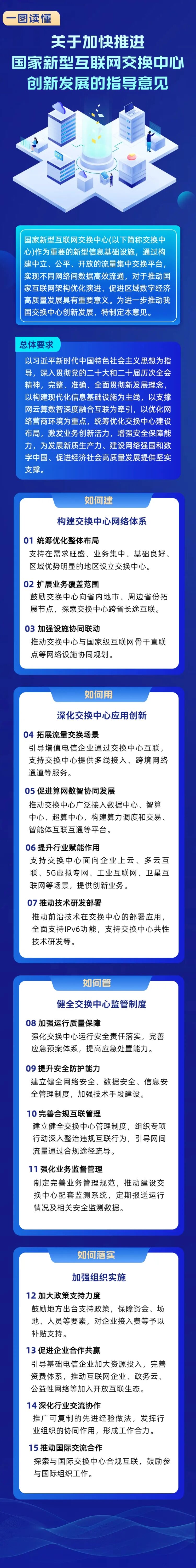為進(jìn)一步推動(dòng)我國(guó)交換中心創(chuàng)新發(fā)展,工業(yè)和信息化部近日印發(fā)《關(guān)于加快推進(jìn)國(guó)家新型互聯(lián)網(wǎng)交換中心創(chuàng)新發(fā)展的指導(dǎo)意見》,明確以構(gòu)建現(xiàn)代化信息基礎(chǔ)設(shè)施為主線,以支撐網(wǎng)云算數(shù)智深度融合互聯(lián)為牽引,以優(yōu)化網(wǎng)絡(luò)營(yíng)商環(huán)境為重點(diǎn),統(tǒng)籌優(yōu)化交換中心建設(shè)布局,激發(fā)業(yè)務(wù)創(chuàng)新活力,增強(qiáng)安全保障能力,為發(fā)展新質(zhì)生產(chǎn)力、建設(shè)網(wǎng)絡(luò)強(qiáng)國(guó)和數(shù)字中國(guó)、促進(jìn)經(jīng)濟(jì)社會(huì)高質(zhì)量發(fā)展提供堅(jiān)實(shí)支撐。《指導(dǎo)意見》聚焦“如何建”“如何用”“如何管”“如何落實(shí)”等四方面問題,提出構(gòu)建交換中心網(wǎng)絡(luò)體系、深化交換中心應(yīng)用創(chuàng)新、健全交換中心監(jiān)管制度、加強(qiáng)組織實(shí)施等四個(gè)方面十五項(xiàng)具體舉措。