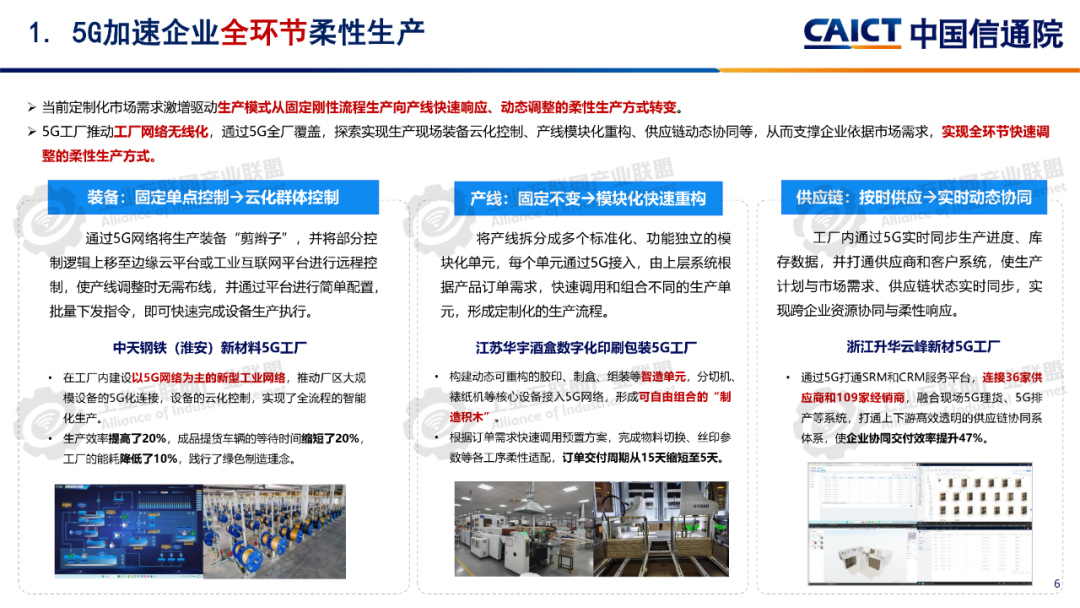 報告分析,1260個5G工廠名錄項目已覆蓋全國28個省(自治區、直轄市)、9個國民經濟門類、60個國民經濟大類。同時5G工廠作為推進工業和信息化深度融合的重要舉措,原材料工業、裝備工業、消費品工業、電子信息、能源交通等行業企業與基礎電信企業、設備及行業服務商深度合作,形成100個5G工廠典型應用實踐,各工廠平均5G網絡覆蓋率高達99.3%、現場裝備聯網率高達97.7%、無線設備5G聯網率達97%,“5G+工業互聯網”應用場景建設數量達10.5個,5G在工廠內由“單點”應用向全環節、全流程、全周期、全局、自主協同等“綜合”應用發展。一是加速企業全環節柔性生產。5G工廠推動工廠網絡無線化,通過5G全廠覆蓋,探索實現生產現場裝備云化群體控制、產線模塊化快速重構、供應鏈實時動態協同等,從而支撐企業依據市場需求,實現全環節快速調整的柔性生產方式。二是5G+數字孿生實現生產全流程精益管控。通過5G工廠系統性實施, “5G+數字孿生”已從產品研發設計、企業生產運營的可視化應用,擴展到安全生產閉環管控、廠區物流實時優化、關鍵部件精準運維等應用,實現了“虛實映射、實時監控”的工廠生產全流程精益管理。三是5G+大數據賦能企業全生命周期能碳精準管理。企業通過5G工廠建設,充分利用5G實現全廠區、全流程能源消耗與關鍵排放源數據的實時采集,構建包含碳排放監測、碳足跡核算、全鏈條碳管理等功能的能效管理體系,形成基于數據驅動的能碳精準管控模式。四是5G+AI助力實現生產全局智能發展。在5G工廠智能化服務應用要求的牽引下,工廠充分利用5G實時采集匯聚全廠及供應商相關數據,推動人工智能應用從單點輔助工具,深入到產品研發、產線生產、系統運維、企業管理等全局,形成生產供應鏈智能全局調度,產品運維智能服務等新模式。五是5G+AI融合形成多機自主協同操控。隨著5G工廠建設質量的不斷提升,5G高可靠、低時延性能不斷增強,人工智能技術的應用開發,設備遠程操控將從早期依賴人工判斷和操作的單點遠程操控,向由數據驅動的多設備自感知、自適應、自決策的智能化無人自主協同操控演進。