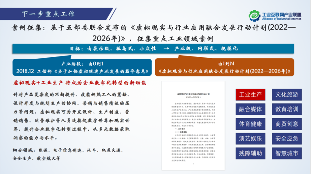 下一步,工業(yè)VR/AR特設(shè)組將基于五部委聯(lián)合發(fā)布的《虛擬現(xiàn)實(shí)與行業(yè)應(yīng)用融合發(fā)展行動計劃(2022-2026年)》,征集包括能源、電子信息制造、汽車、軌道交通、安全生產(chǎn)、航空航天等重點(diǎn)工業(yè)領(lǐng)域案例。