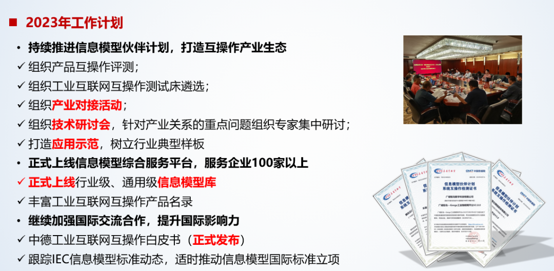 會議由智能物聯(lián)模型特設(shè)組聯(lián)執(zhí)主席黃穎主持。首先回顧了特設(shè)組2022年的工作情況,重點(diǎn)圍繞工業(yè)互聯(lián)網(wǎng)互操作產(chǎn)業(yè)生態(tài)構(gòu)建展開工作,包括發(fā)起信息模型伙伴計劃、啟動產(chǎn)品互操作評測、建設(shè)信息模型公共服務(wù)能力、編制中德工業(yè)互聯(lián)網(wǎng)互操作白皮書等。隨后,在企業(yè)分享環(huán)節(jié),來自中國信通院、樹根互聯(lián)、華中數(shù)控、儀綜所、中汽數(shù)據(jù)、思謀科技、中電科普天科技7家單位的專家就互操作評測、互操作標(biāo)準(zhǔn)化發(fā)展等進(jìn)行交流,并從不同角度分享了互操作技術(shù)在操作系統(tǒng)、云平臺、機(jī)床、汽車等軟硬件方面的應(yīng)用實(shí)踐。在標(biāo)準(zhǔn)研討環(huán)節(jié),來自華為的專家介紹了《電子裝聯(lián)行業(yè)生產(chǎn)設(shè)備交互信息模型》標(biāo)準(zhǔn)草案,與會專家進(jìn)行了熱烈討論。來自國網(wǎng)遼寧省電力有限公司、中汽數(shù)據(jù)等專家提出了《能源工業(yè)互聯(lián)網(wǎng)信息模型標(biāo)準(zhǔn)》《汽車企業(yè)信息模型規(guī)范》2項(xiàng)標(biāo)準(zhǔn)的立項(xiàng),經(jīng)討論,一致同意2項(xiàng)標(biāo)準(zhǔn)予以立項(xiàng)。下一步,智能物聯(lián)模型特設(shè)組將聚合產(chǎn)業(yè)各方資源,積極推進(jìn)信息模型伙伴計劃,持續(xù)構(gòu)建互操作產(chǎn)業(yè)生態(tài),推動信息模型落地應(yīng)用。