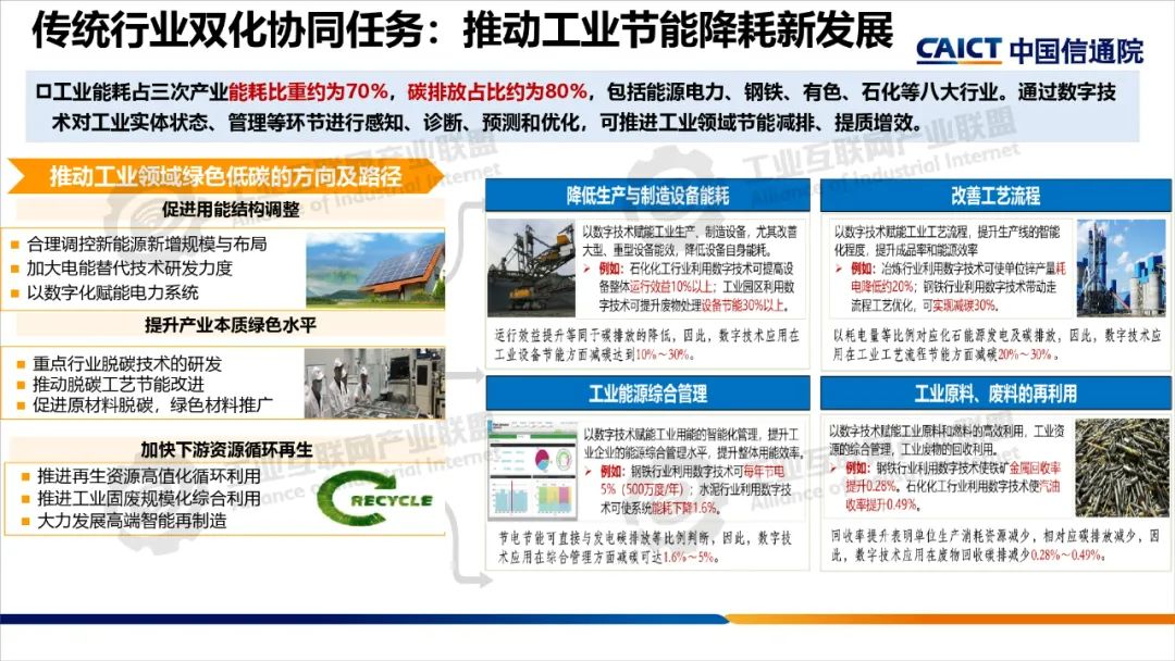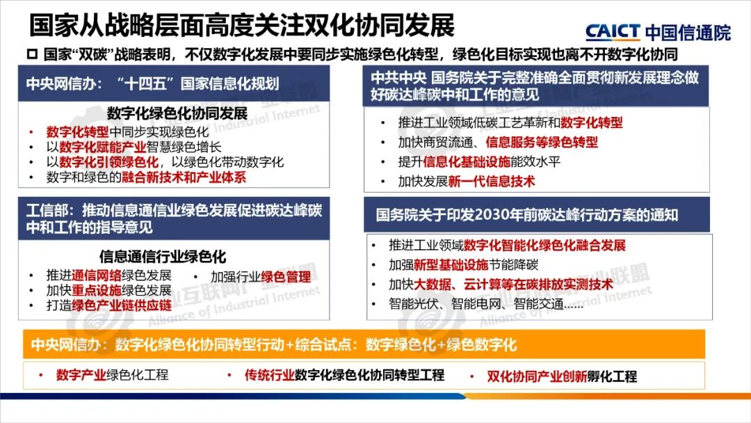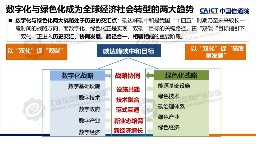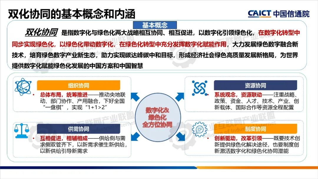本期為您帶來由中國信息通信研究院產業與規劃研究所高級工程師王婧媛分享的《數字化綠色化協同轉型綜合試點建設解讀》。數字化轉型和綠色化轉型不僅是當今世界發展的兩大主題,也是相互依存、相互促進的孿生體。“雙化協同”是指數字化與綠色化兩大戰略相互協同、相互促進,在數字化轉型中同步實現綠色化,以綠色化帶動數字化,在綠色化轉型中充分發揮數字化賦能作用,大力發展綠色數字融合新技術,培育綠色數字產業新生態。