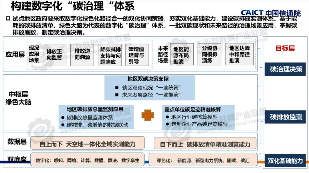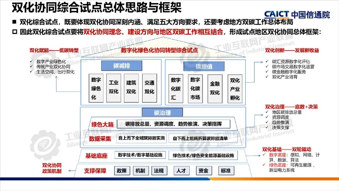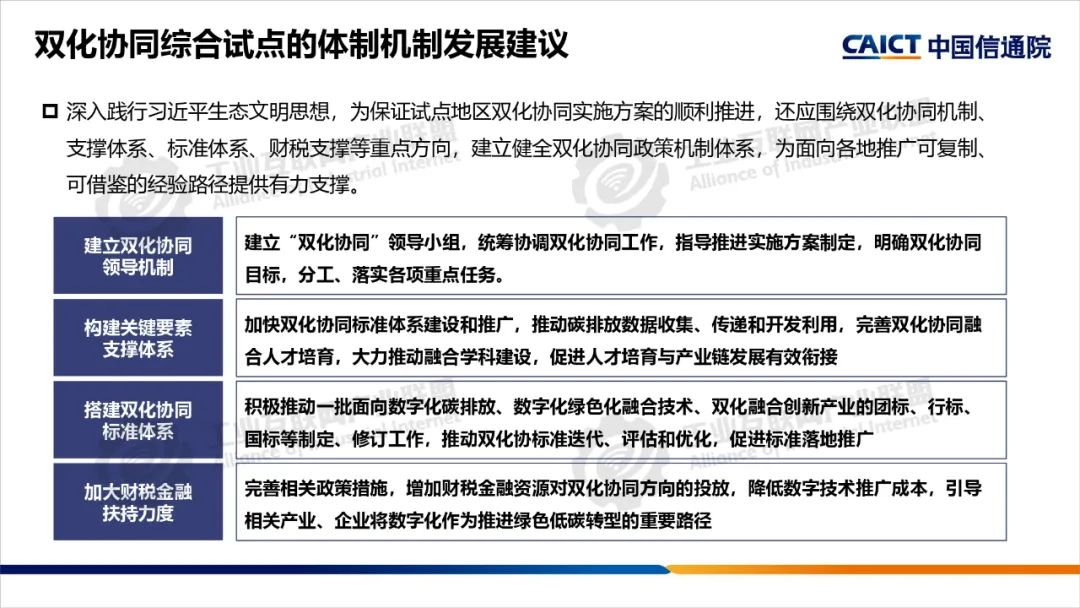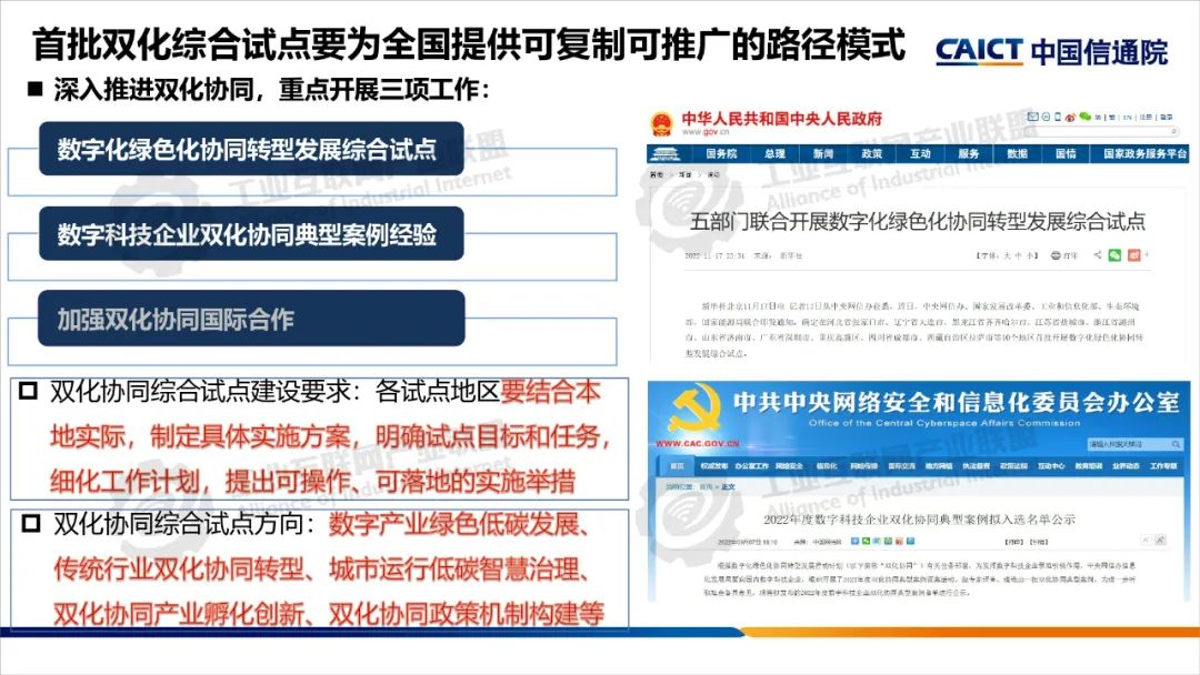 2022年,中央網信辦等五部門聯合開展了雙化協同綜合試點建設,要求各試點地區制定具體實施方案,部署了五大建設方向。雙化綜合試點地區要將雙化協同理念、建設方向與地區雙碳工作相互結合,從打造數字底座+綠色底座夯實雙化基礎,以雙化治理探明地區碳排放底數、支撐決策治理,以雙化賦能實現數字產業綠色化、傳統產業和生活低碳化,以雙化創新開展數字化生態資源、碳市場和碳金融的高效價值轉化,培育雙化新技術、新產業,最后還要配套雙化協同政策、要素、標準、財稅等機制創新。