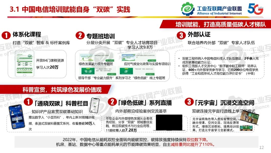 本期為您帶來由工業互聯網產業聯盟碳達峰碳中和組副主席、中國電信工業事業部總裁助理仲肇中分享的《高質量雙碳實踐,培訓賦能》。工業雙碳要貫徹“立足我國能源資源稟賦,堅持先立后破,有計劃分步驟實施碳達峰行動。”,深刻理解“實現碳達峰碳中和是一場廣泛而深刻的經濟社會系統性變革”。政府官員、企業各級人員、雙碳服務提供商都應參加“雙碳”系統培訓。“雙碳”培訓機構在做好培訓的基礎上,要努力成為“雙碳”實踐經驗分享平臺、實踐模式探索平臺、供需對接的交流平臺、新技術、研發成果轉化平臺、雙碳各領域交叉融合創新平臺。