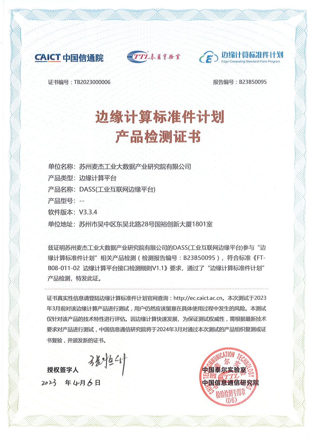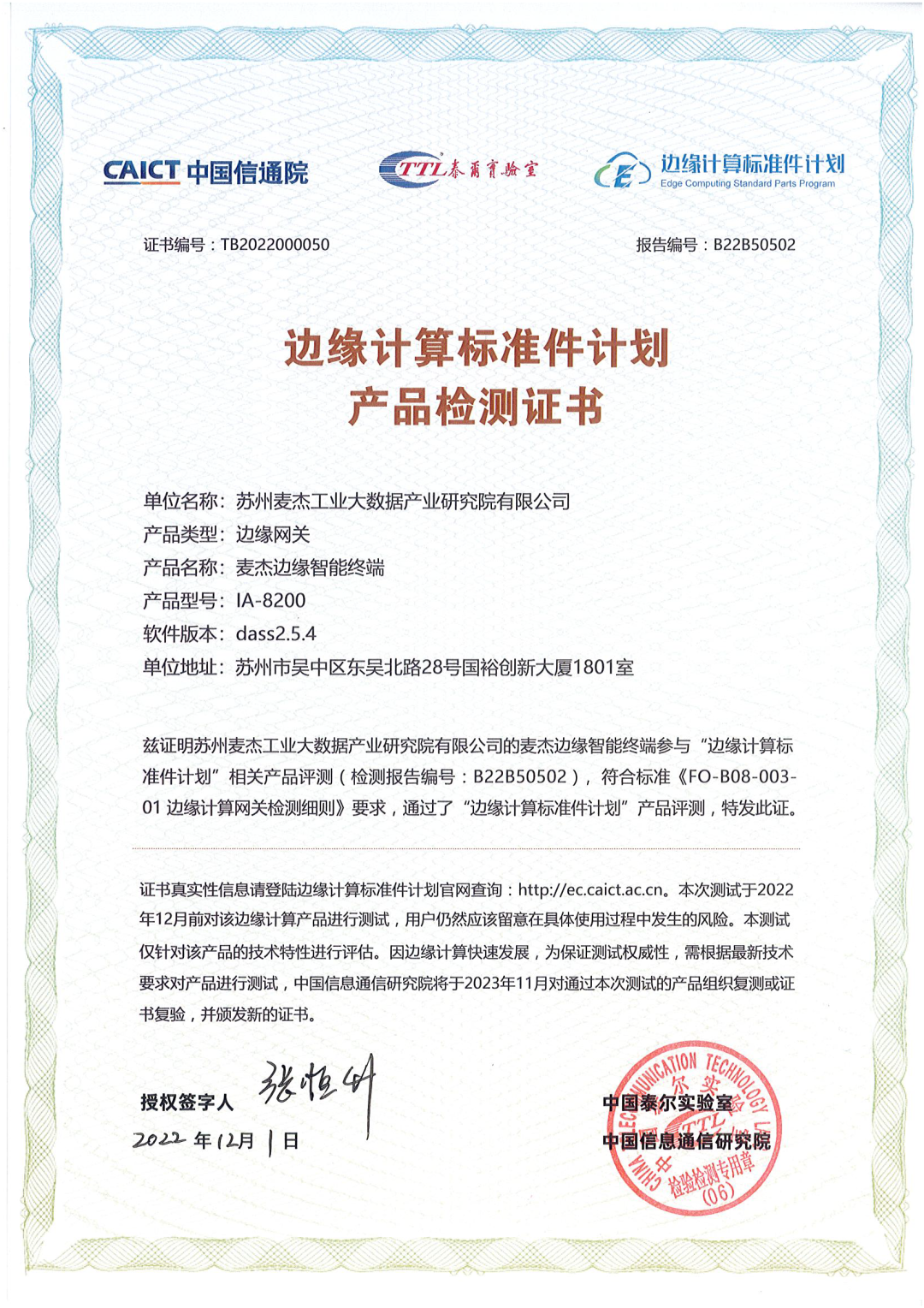 “邊緣計(jì)算標(biāo)準(zhǔn)件計(jì)劃”證書