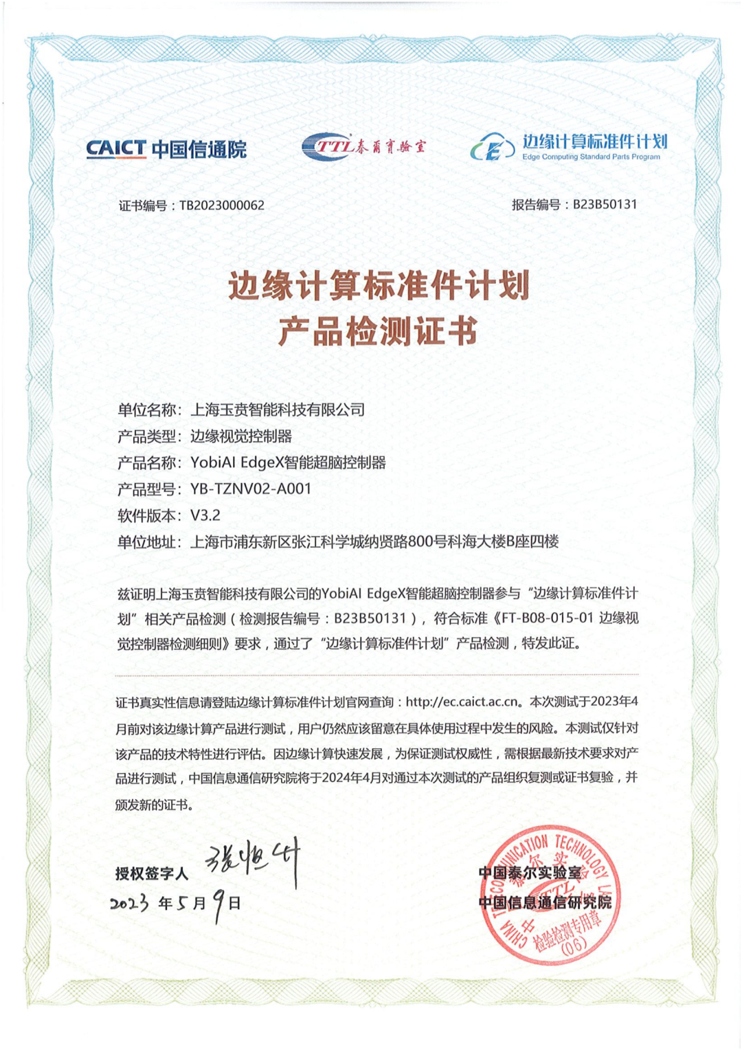 上海玉賁智能科技有限公司(以下簡稱“玉賁智能”)作為此次通過“邊緣計算標準件計劃”產品測試的廠家,針對制造業工廠安全生產智能監管的場景,推出邊緣視覺控制器——YobiAI EdgeX智能超腦控制器 ,采用一體化的AIoT架構,具備邊端數據采集、100毫秒實時分析、云聯動及邊端自學習、識別+控制三方設備啟停等能力,體現了其作為工業數字化轉型先行者的技術積累和深厚的研發實力。